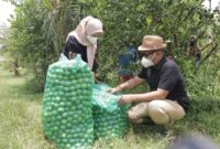 Bupati Gresik, Fandi Akhmad Yani (Gus Yani) panen jeruk seng biasa kanggo soto nek desa Kebonagung, kecamatan Ujung Pangkah, Gresik, Jumat (04/03/2022). Nurul Harmaini…