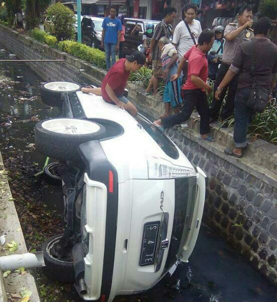 “Ketika mobil mau putar balik sekira pukul 09.00 WIB, mobil dari arah utara ke selatan sempat menabrak reklame dan langsung terperosok ke selokan” ucap Adi (29), Saksi mata yang turut mengevakuasi mobil.