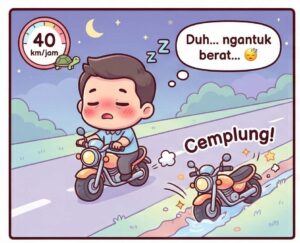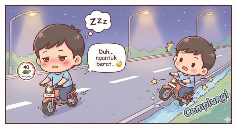 Fiqih Mengendarai motor dengan gontai di JL Raya Banjarsari Cerme dan Akhirnya Nyemplung parit.