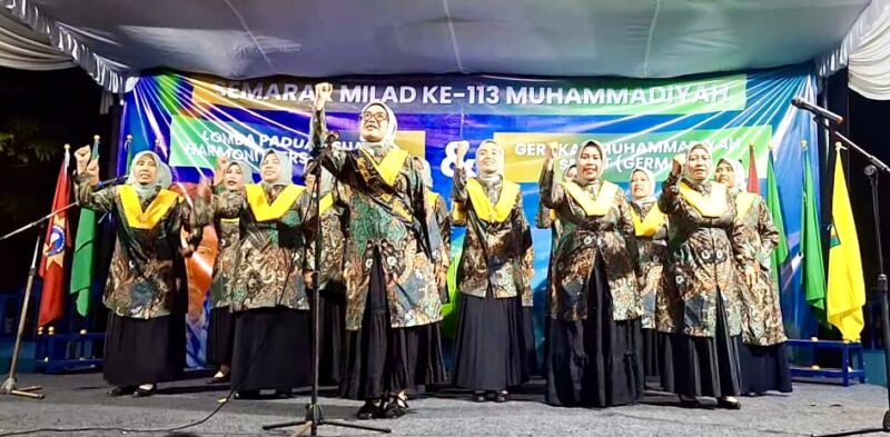 Setelah yel-yel, peserta membawakan lagu wajib “Mars Muhammadiyah”. Aransemen harmoni yang disajikan—mulai dari suara sopran lembut hingga alto yang kuat—membuat suasana panggung kian berwibawa. Para penonton tampak menikmati setiap penampilan, memberi tepuk tangan meriah di setiap akhir lagu.