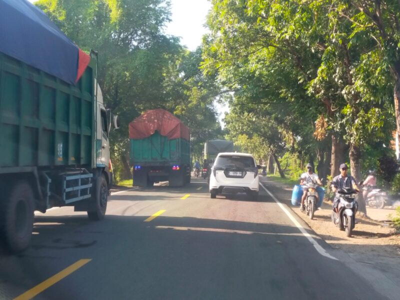 Sejumlah dump truk bermuatan material galian C masih terlihat melintas di jalur nasional Gresik Utara pada Senin pagi (16/3/2026), meski pemerintah telah memberlakukan pembatasan operasional angkutan barang selama arus mudik dan arus balik Lebaran 2026.