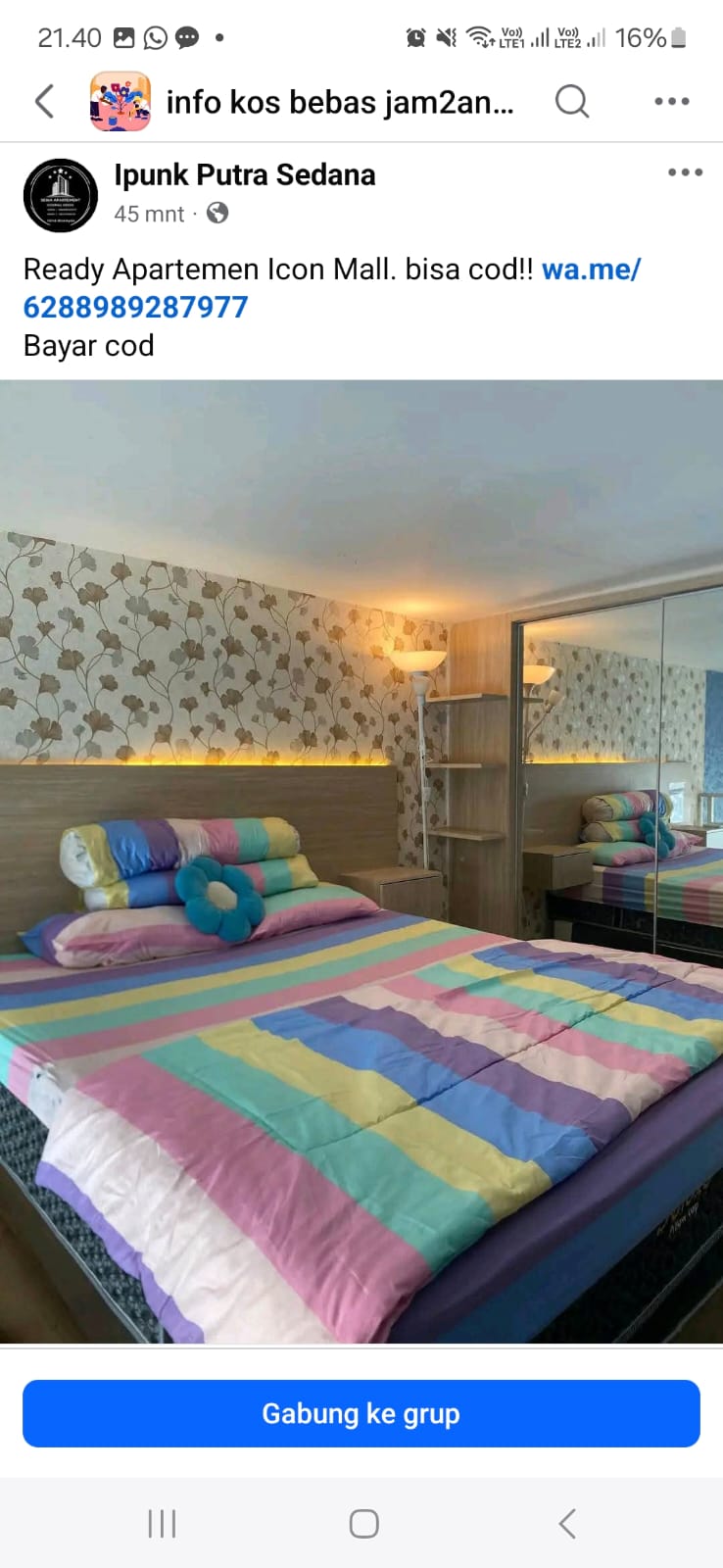 Hunian di Jalan Dr. Wahidin Sudirohusodo, Kecamatan Kebomas, ini ditawarkan terbuka di grup Facebook mulai Rp90 ribu per jam. Salah satunya diunggah akun @nandofernando yang menulis, “Ready Apartemen Iconmall Gresik, jam-jaman dan harian start 90K. Bebas privasi aman, pembayaran bisa COD.”