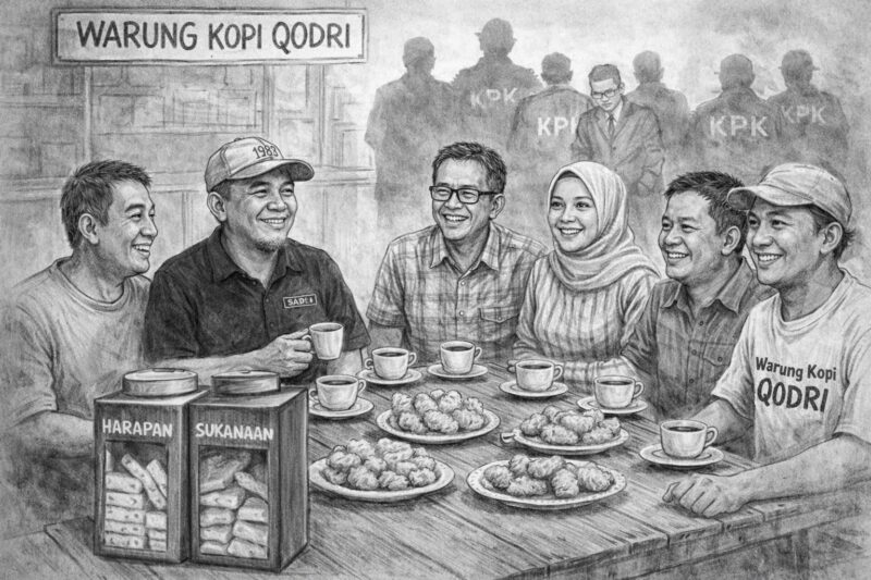 Cak Qodri mesem banjur guneman, “Sik-sik yu Karti, sampeyan iki pesen ngombe apa? Durung-durung kok wis emosi bengol-bengok mikiri korupsi. Agus karo Slamet, ngombe apa iki?”