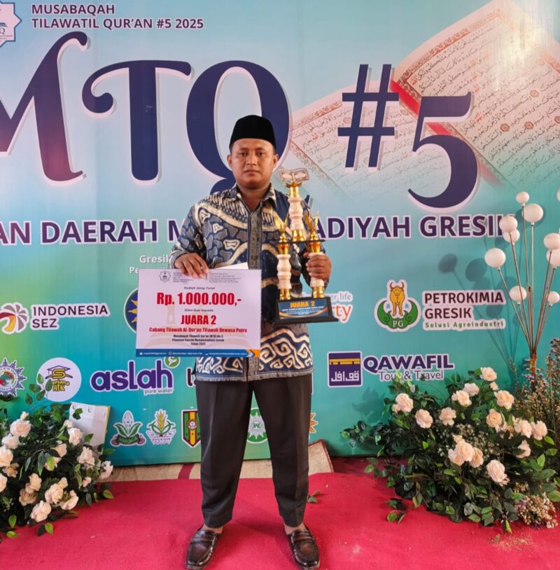 GIRIMU.COM — Kabar gembira datang dari panggung utama di Perguruan Muhammadiyah Cerme, Gresik, Jawa Timur, pada Ahad (13/10/2025). Khatibul Umam Al Ghani, penaggung jawab kelas tahfidz SD Al Islam Cerme, sukses meraih juara 2 tilawah Al Quran dewasa dalam ajang Lomba Musabaqoh Tilawatil Qur’an (MTQ) V yang dihelat Pimpinan Daerah Muhammadiyah (PDM) Gresik 2025.