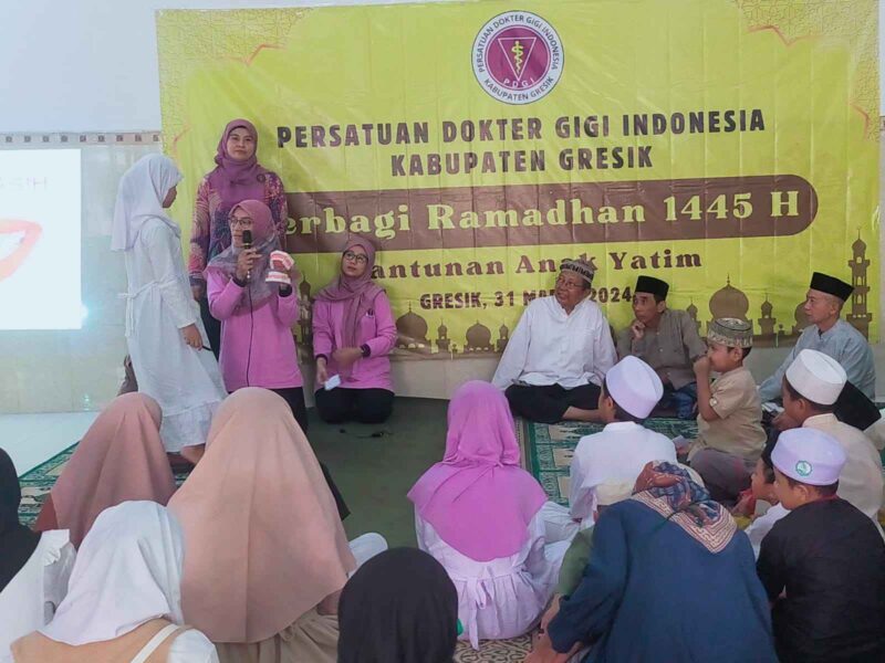 Ia berharap, dari kegiatan kolaborasi ini nantinya dapat memupuk kepedulian sosial rekan sejawatnya, juga agar beroleh keberkahan di bulan suci kali ini. Selanjutnya, sosialisasi tentang kesehatan gigi dan mulut kepada anak-anak oleh PDGI Kabupaten Gresik dipandu oleh drg Reni Puspa Daniati, Sp. prosto.