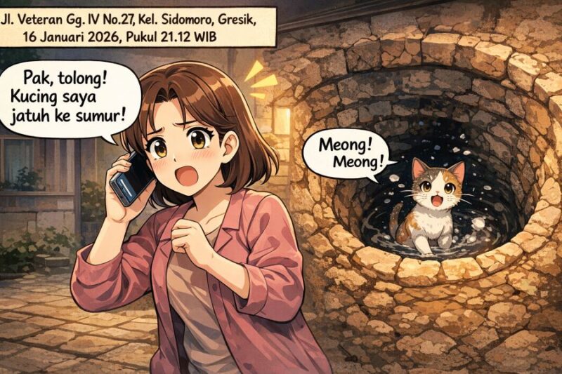 Petugas Dinas Pemadam Kebakaran dan Penyelamatan Kabupaten Gresik berhasil mengevakuasi seekor kucing yang terjebur ke dalam sumur sedalam kurang lebih 25 meter di Jl. Veteran Gg. IV No. 27 RT 002/RW 002, Kelurahan Sidomoro, Kecamatan Gresik, Kabupaten Gresik, pada Jumat malam (16/1/2026).