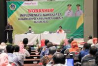Bupati Gresik Fandi Akhmad Yani membuka acara sekaligus memberikan arahan dalam kegiatan Workshop Implementasi Nawakarsa dalam Rencana Kerja Pemerintah Daerah (RKPD) Kabupaten Gresik tahun…