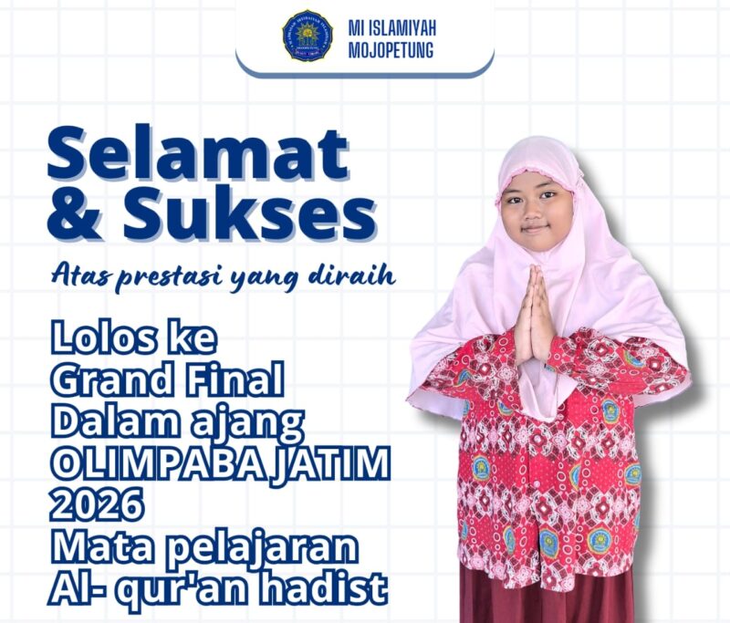 Prestasi membanggakan kembali diraih MI Islamiyah Mojopetung (MIISMO). Salah satu siswinya, Mumtazah Himmatina Mardhatillah, berhasil meraih Juara 2 Olimpiade Mata Pelajaran Qur’an Hadist tingkat kabupaten dalam ajang OLIMPABA 2026.