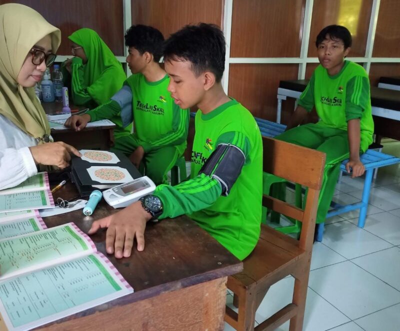 Sebanyak 256 siswa SMP Muhammadiyah 1 (Spemutu) Gresik menjalani screening kesehatan menyeluruh untuk memantau kondisi fisik dan kesehatan reproduksi. Pemeriksaan meliputi pengukuran tinggi dan berat badan, indeks massa tubuh, tekanan darah, golongan darah, buta warna, hingga tes mata.