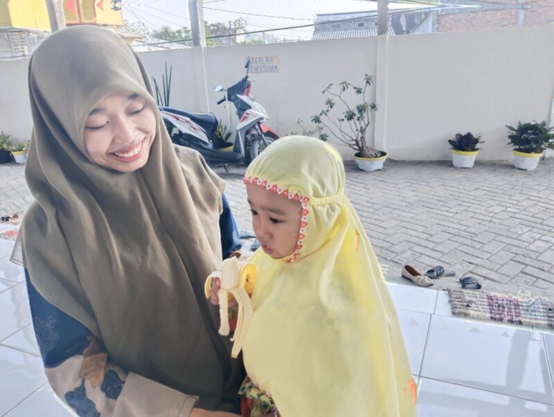 Fahmi Masruroh, ibu dari Aisyah tertawa melihat polah lucu Aisyah ketika menyadari sang putri belum paham maksud acara pagi ini. “Senang melihat lomba pagi ini meskipun Asiyah belum paham, paling tidak sudah bisa menstimulus motorik dan kinestetiknya,” ucapnya.