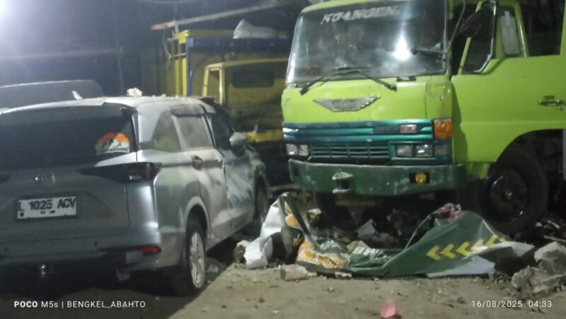 Kabar Gresik – Kecelakaan maut terjadi di Jalan Raya Krikilan, Kecamatan Driyorejo, Gresik, Sabtu (16/8/2025) pagi. Insiden melibatkan dua truk, satu sepeda motor, dan sebuah mobil yang sedang terparkir di bengkel.