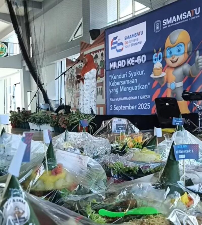 GIRIMU.COM — Enam puluh tahun perjalanan SMA Muhammadiyah 1 Gresik (Smamsatu) dirayakan dengan cara sederhana, namun penuh makna: kenduri tumpeng. Lantai 7 yang merupakan lapangan indoor kebanggaan sekolah favorit di Gresik ini berubah menjadi ruang syukuTumpengr.